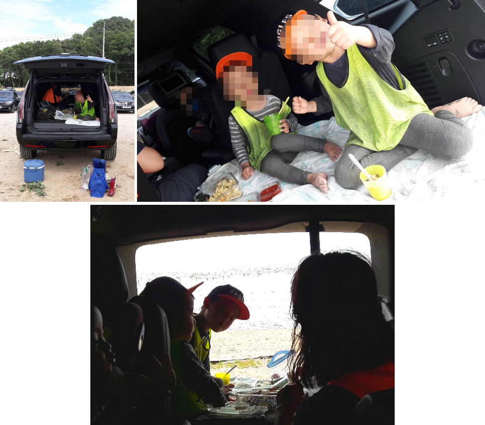 여기에 인천 바다에서는 바다를 바라보며 아이들이 음식을 먹을 수 있도록 3열시트를 접고 바다를 바라보았다.