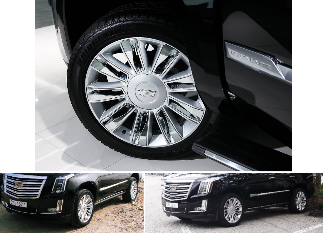 다음으로 5,180mm의 전장과 1,900mm의 전고, 2,045mm의 전폭을 통해 거대한 차체를 완성한 에스컬레이드 플래티넘이 몸집에 걸맞는 22인치 휠로 존재감을 표현했다.