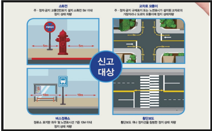 4대 절대 불법 주정차 관행은 소화전 5m 이내, 교차로 모퉁이 5m 이내, 버스 정류소 10m 이내, 횡단보도가 해당된다. 현재 주정차가 많았던 곳이나, 이제부터는 절대로 주정차를 허용하지 않는다.