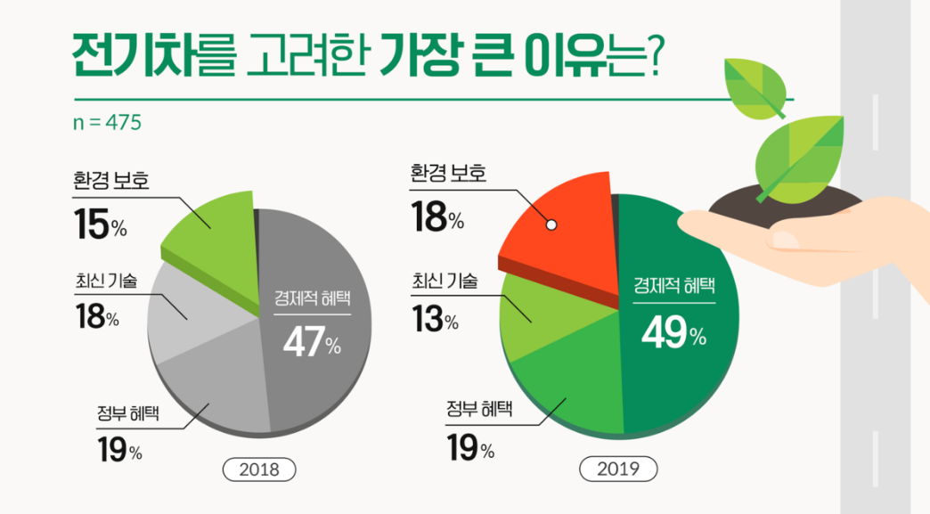 전년 결과와 가장 큰 차이점은 전기차 선택의 이유로 '환경 보호(18%)'라고 답변한 사람이 3%이상 늘어난 점이다. 최근 심각한 미세먼지와 대기환경 오염으로 친환경에 대한 관심이 높아진 점이 이번 설문결과에 그대로 반영되어 나타났다.