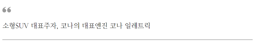 국내 소형SUV 시장은 쌍용 티볼리와 현대 코나가 양분하고 있다. 하지만, 쌍용 티볼리의 경우에는 가솔린과 디젤 2가지 파워트레인만 존재하는데 반해, 현대자동차 코나는 가솔린과 디젤 외에도 전기차 모델인 코나 일렉트릭이 존재한다. 코나 일렉트릭은 소형SUV 대표모델이자 높은 경쟁력을 갖춘 모델이다.