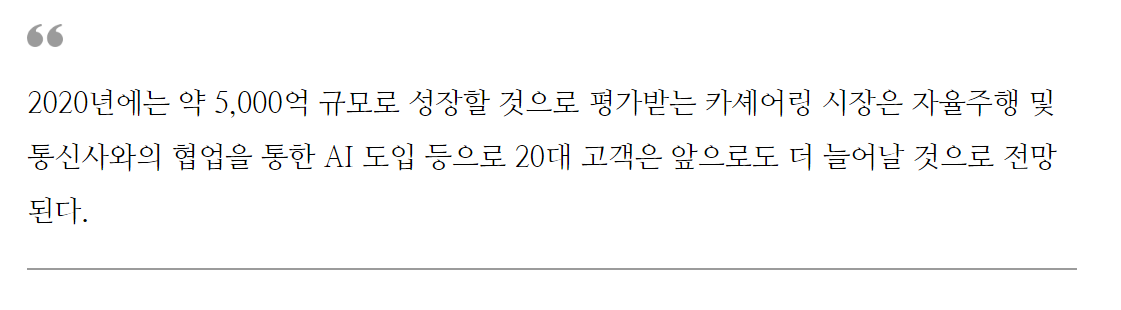 현재 시장규모는 약 2250억 규모이지만, 카셰어링 서비스는 젊은 고객이 많다는 점에서 매우 매력적인 시장이자 미래지향적인 사업으로 평가받고 있다. 특히, 카셰어링을 이용하는 20대 비율이 전체 이용자의 약 73%를 차지해 잠재고객 유치에 유리한 서비스로 평가받는 이유이다.