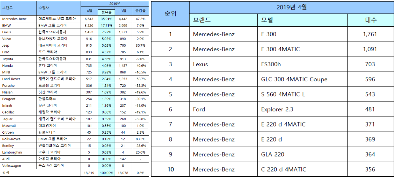 2019년 수입차 시장은 메르세데스 벤츠의 세상이라고 해도 과언이 아니다. 메르세데스 벤츠는 2019년 4월 6,543대로 판매량을 보이며, 전월 대비 47.3%의 성장을 기록했다.