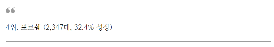 올 해 높은 성장세를 보이는 가장 큰 이유는 1월 출시한 풀 체인지 카이엔의 호조와 국내 시장 진출 32년 만에 최초로 연간 판매 4000대 돌파 기록의 1등공신인 파나메라 시리즈가 소비자들에게 높은 인기를 끌고 있기 때문이다.