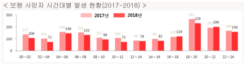 국내 교통사고 중 보행 사망자가 가장 많이 발생하는 시간대는 18∼20시(229명), 20∼22시(199명), 22∼24시(156명) 순으로 어두워지는 저녁 시간대로 운전자의 가시권이 줄어드는 상황이 사고발생률을 높이는 걸 알 수 있다. (운전자의 잘못이 아닌 사고 경중이 커지는 것을 말하는 부분이니 오해하지 않길...)