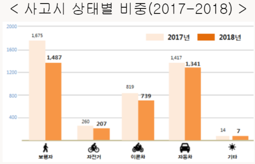 지난 2월 경찰청과 국토교통부가 내놓은 2018년 교통사고 분석 결과에 따르면, 보행자 사고 사망건수는 1,487건으로 자동차사고 사망자수 1,341건보다 높다.