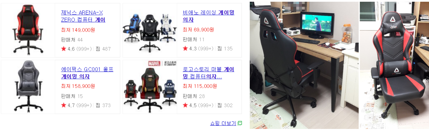 '컴퓨터 의자'와 '의자 선물'로 검색해 본 결과, 게이밍의자라는 단어와 함께 '제닉스 아레나'의자 관련 글들이 많이 보였다.