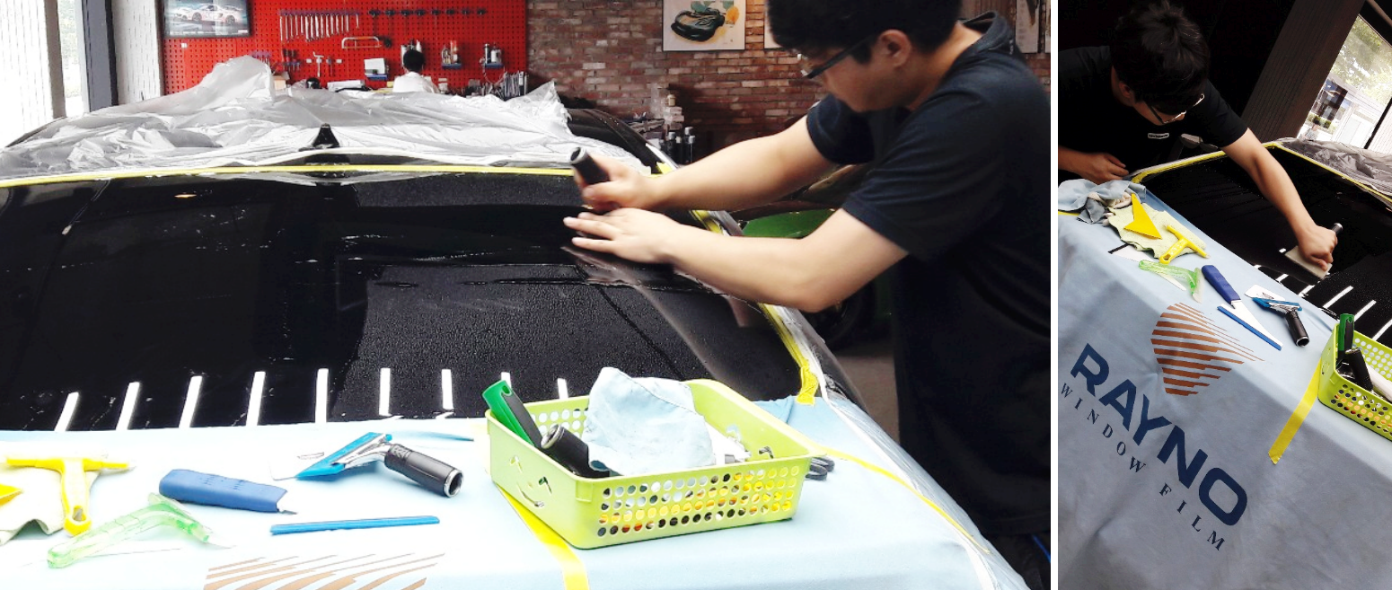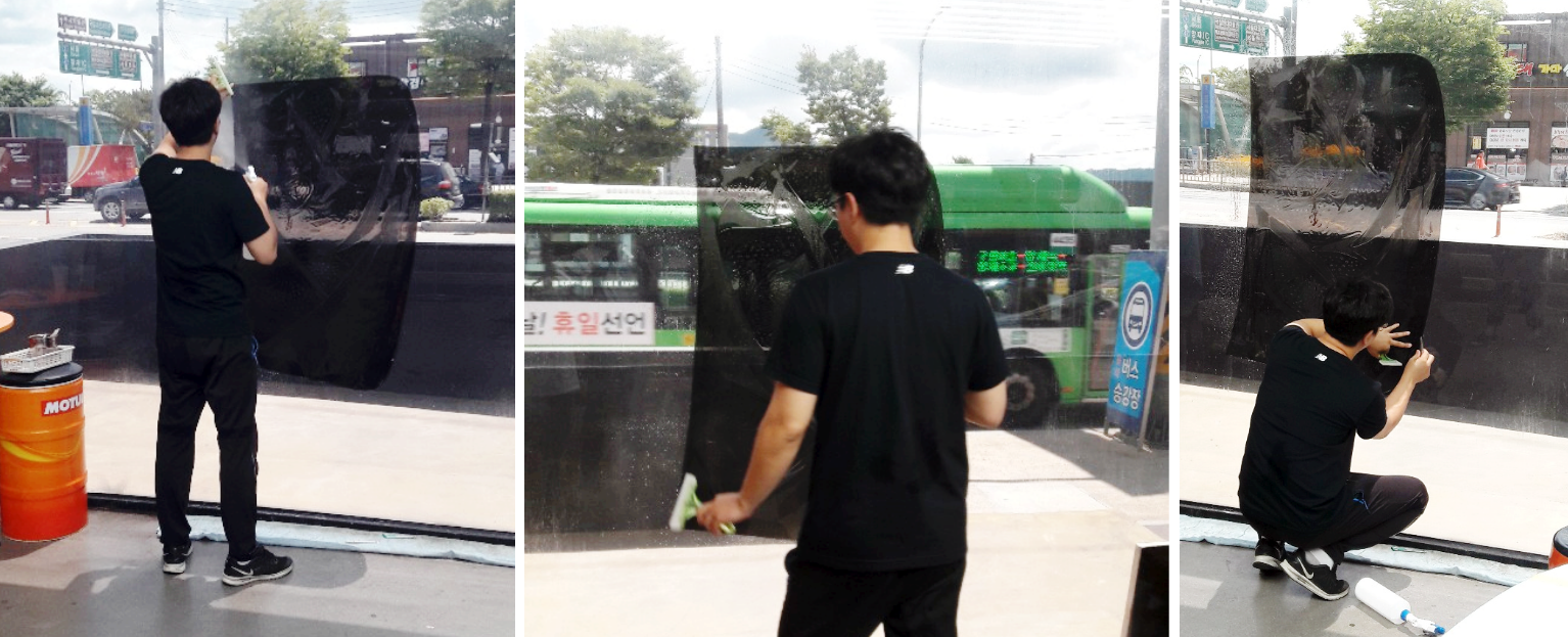 하지만, 기존 차량의 안쪽의 유리 안쪽에만 붙히면 되는 시공과 다르게 외부에는 이물질 제거와 유리세척 과정이 필요하고, 자동차 유리전면을 덮어야 하기 때문에 후면 유리 곡선과 크기에 따라 제단하는 과정도 쉽지 않은 일였다.