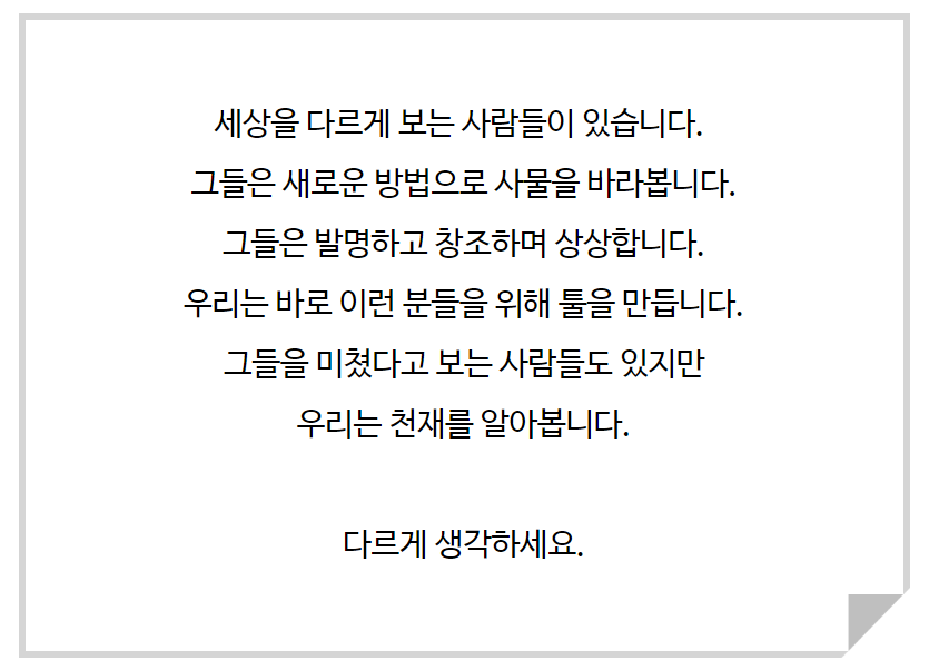 애플의 유명한 광고캠페인 제목과 내용이다. 사람들이 'Yes'라고 말하며 세상에 순응할 때,'No'라고 말하며 다른 방법을 생각하거나 엉뚱한 길을 제시하는 사람들이 있다. 사람들은 이들을 '삐딱선' 또는 '문제아'라고 종종 말하곤 한다.