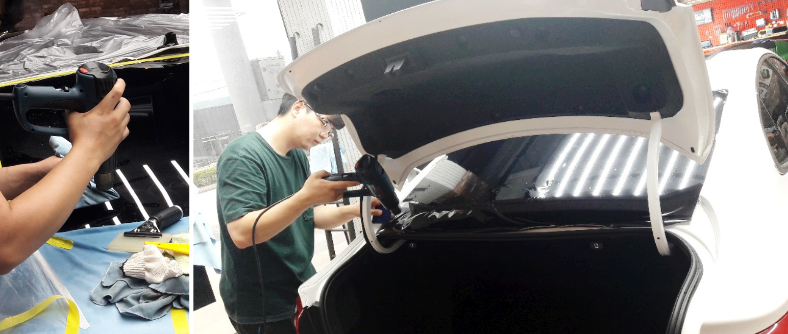 이 때, 유리 곡선과 면에 정확하게 밀착하기 위하여 고열의 열풍기로 유리 전면을 보듬듯 조금씩 늘려가며 크기를 맞춰나가기 시작했다. 이 과정이 생각보다 고난위도라 숙련된 기술자의 썬팅작업 노하우가 없다면 진행하기 쉽지 않은 일로 보였다.