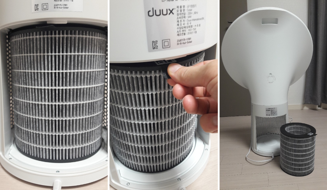 교체 방법은 정말 손쉬운데, 필터 커버 손잡이를 아래로 눌러 열면 기기가 자동으로 꺼지고 필터를 꺼낼 수 있다.