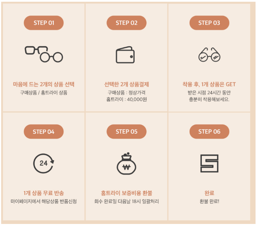 이 서비스는 홈트라이&무료반품 서비스인데, 마음에 드는 선글라스 2개를 선택하여 집에서 착용해보고, 1개 또는 전부를 무료로 반품할 수 있는 서비스였다.