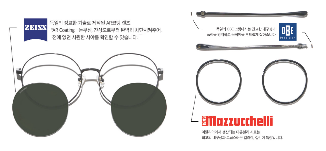 선글라스의 기본인 렌즈는 두말할 필요가 없을 정도로 좋은 독일 '칼 자이스 AR코팅'렌즈를 사용해 UV 100% 차단은 물론 렌즈 안쪽까지 코팅하여 장시간 착용에도 눈의 피로도를 줄이도록 제작되었다.