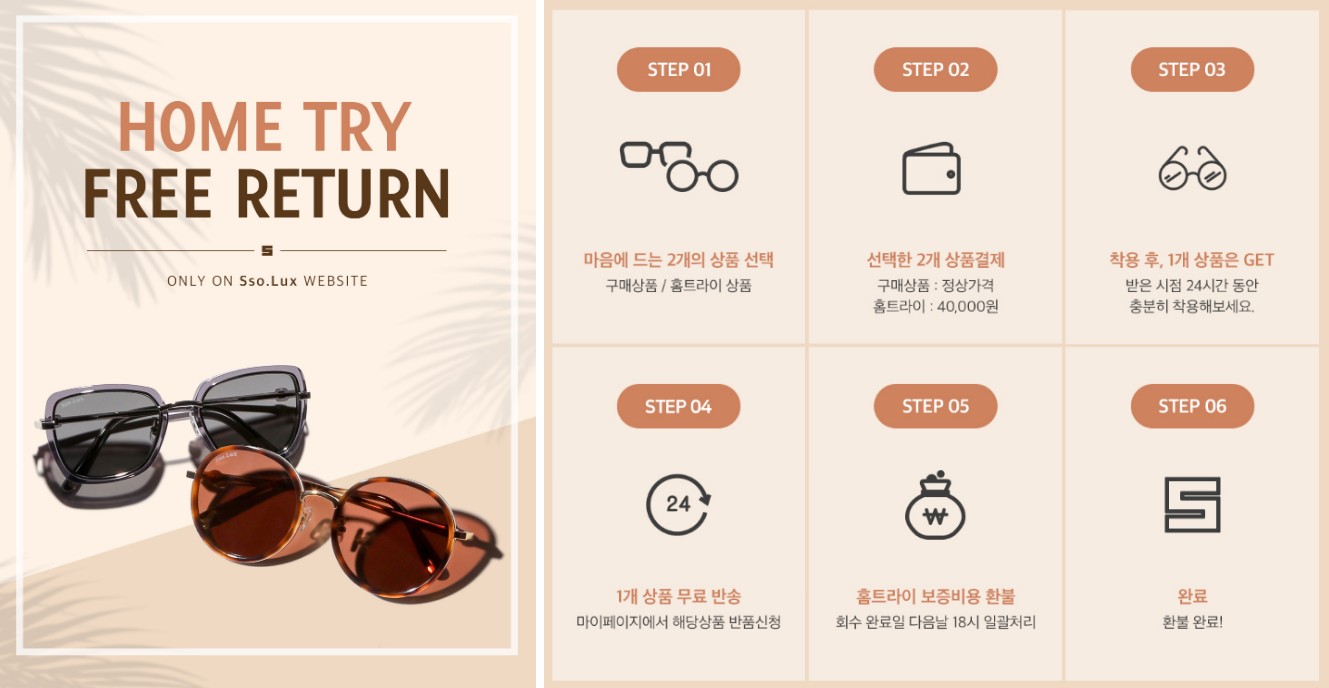 이 서비스는 정확하게 말해 홈트라이&무료 반품 서비스인데, 마음에 드는 선글라스 2개를 선택하여 집에서 착용해보고, 1개 또는 전부를 무료로 반품할 수 있는 서비스이다. 고민없이 나만의 선글라스를 집으로 가져와 착용해보자~!!