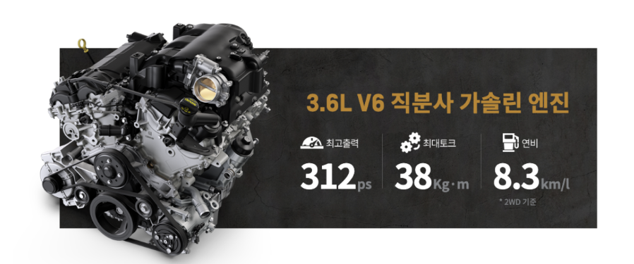 이에 따라 복합연비 8.3km/L (고속연비 10.1km/L, 도심연비 7.3km/L, 2WD 기준) 라는 매력적인 연비 효율을 기록했다.