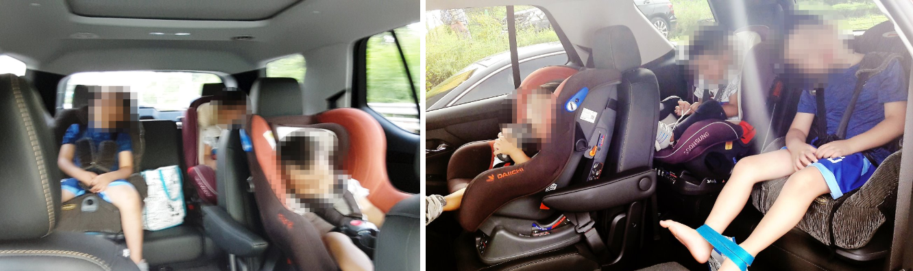 2열에 카시트 2개, 3열에 카시트 2개 다 설치해보고, 뒷좌석에는 조금 더 큰 아이(6세/4세)를 앉혀봐도 큰 불편함이 없었다. 실제로 2시간 이상의 운전에도 큰 소란(?)없이 잠만 잘 잤다.