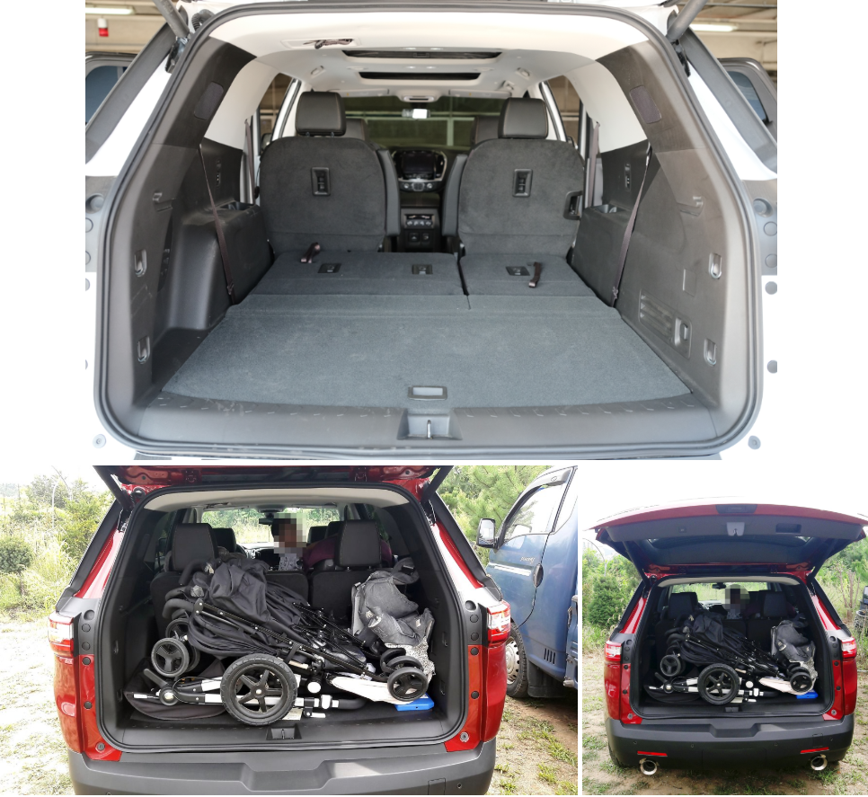 트래버스는 3열을 넉넉하게 이용하여도 트렁크공간을 제대로 사용할 수 있다. 실제로 이번 시승에서 분리형 유모차와 쌍둥이형 유모차 2개를 다 실어도 3열 공간을 조절하지 않아도 되는 경험을 했다.