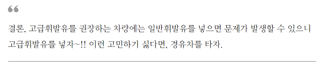 고급휘발유의 '고급'은 비싼 의미는 가질 지언정, 일반자동차를 더 나은 성능과 연비를 개선해준다는 의미는 아니다.