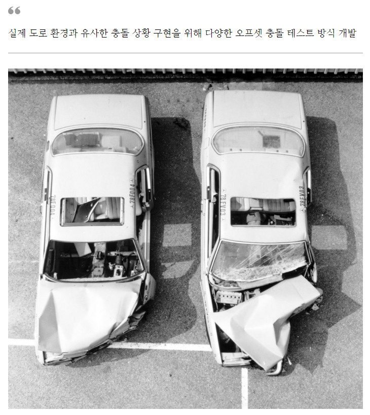 이를 위해 오래된 철 혹은 콘크리트 소재의 단단한 장애물에 정면 충돌 하던 테스트 방식에서 실제 도로 환경과 유사한 충돌 상황을 만들어내는 ‘오프셋(offset) 충돌 테스트’를 설계했다. 이어 1975년에는 오프셋 충돌 테스트에 대한 본격적인 연구가 시작됐다.