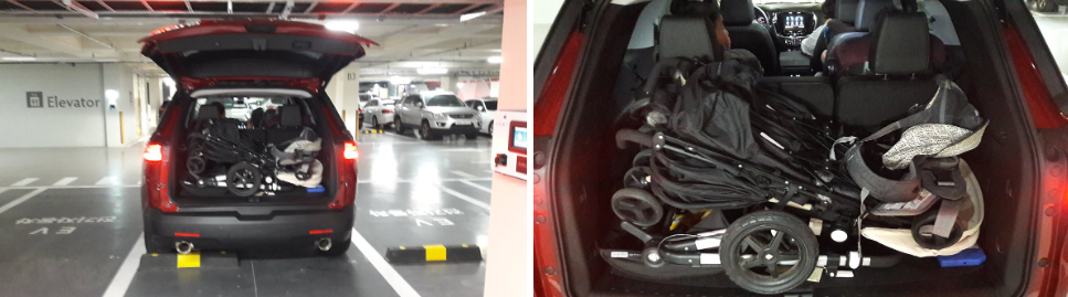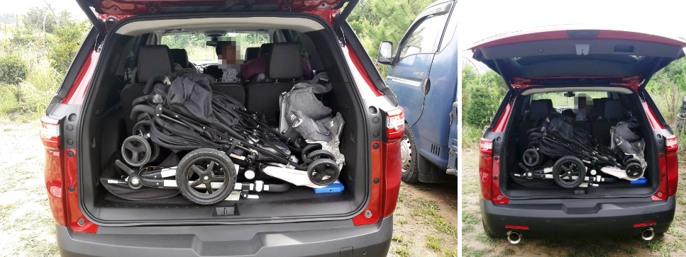 하지만, 아이 3명과 1박 2일의 여행을 하려면 이사 수준의 가방과 짐, 유모차, 먹거리 등이 필요하기 때문에 트렁크 공간은 선택이 아닌 필수사항이다.