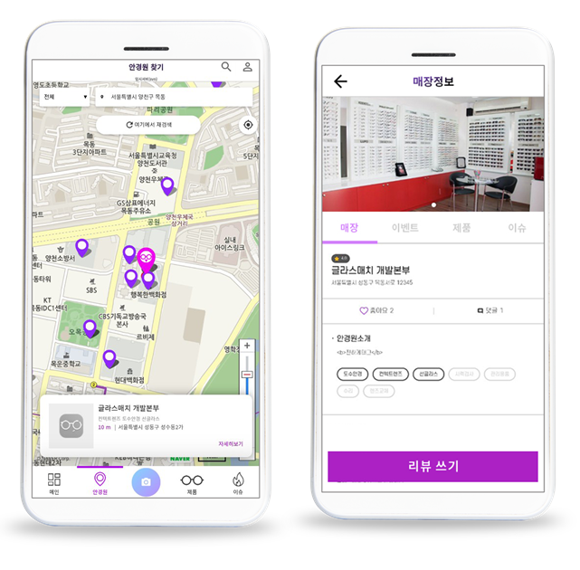 두 번째로 아이웨어 제품과 제품 브랜드의 자세한 정보를 알 수 있고, 구매할 수 있는 쇼핑몰 / 안경원을 한 번에 알려주는 인터페이스가 편리하고 손쉽다.