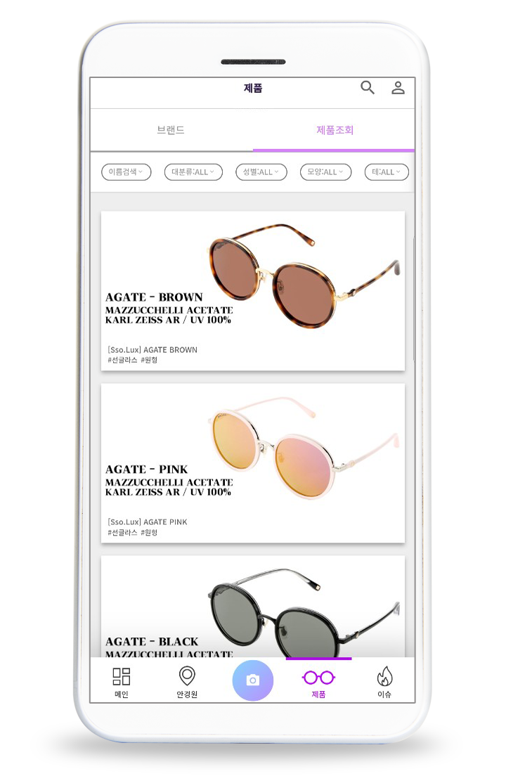 마음에 드는 선글라스가 안경원에서 판매하는 제품이라면 가까운 안경원 위치 정보와 프로모션도 확인 가능하고, 온라인 브랜드제품은 가상으로 착용해보고 쇼핑몰로 간편하게 이동할 수 있어 바로 구입도 가능했다.