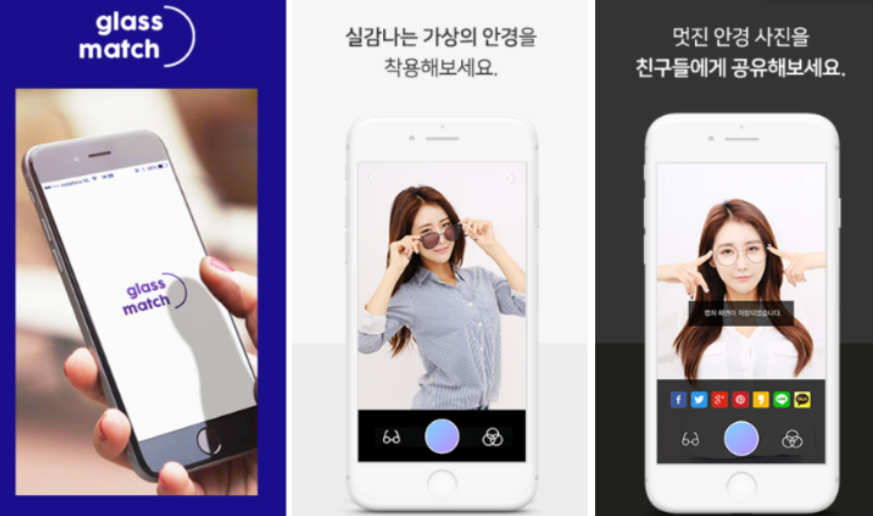 글래스매치 어플은 사용자 얼굴 특징을 파악하는 얼굴인식 기술과 AR(증강현실)기술을 통해 셀피를 찍듯 손쉽게 영상으로 어울리는 안경을 확인하고, 안경을 착용한 모습을 사진으로 저장도 가능하다. 영상으로는 개인 최적화된 상태를 확인하고, 이미지는 지인 전달용이랄까??