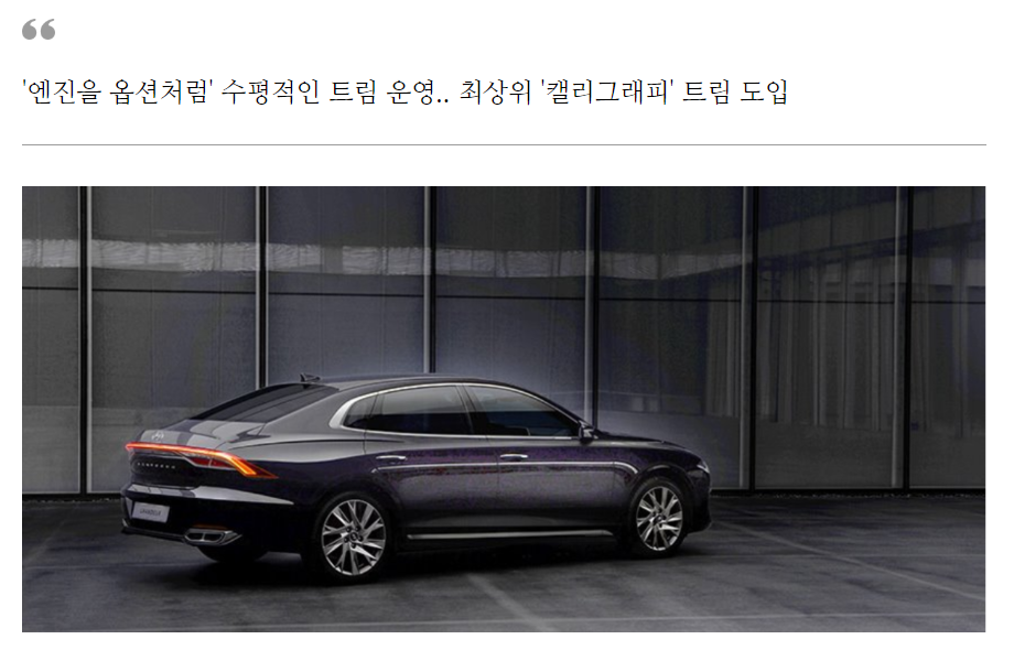 현대차는 고객이 더 뉴 그랜저의 트림을 보다 쉽게 선택할 수 있도록 수평적인 구조로 트림을 운영하기로 했다. 엔진 별로 선택할 수 있는 트림이 상이한 일반적인 형태 대신, 원하는 트림을 자유롭게 고른 뒤 엔진을 옵션처럼 선택할 수 있도록 트림을 운영하는 것이다.