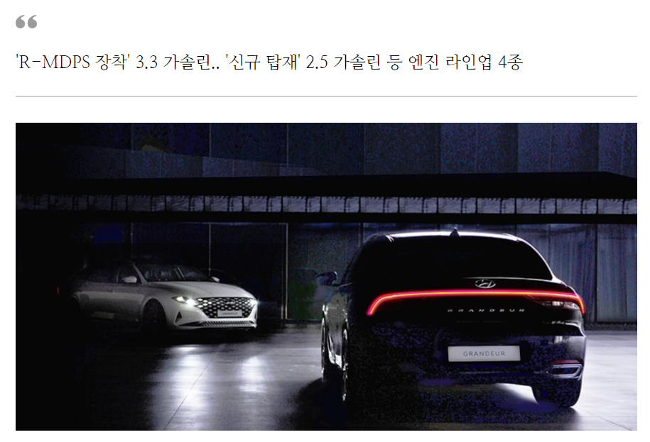더 뉴 그랜저는 2.5 가솔린, 3.3 가솔린, 2.4 하이브리드, 3.0 LPi 등 총 네 가지 엔진 라인업으로 동시에 출시된다.