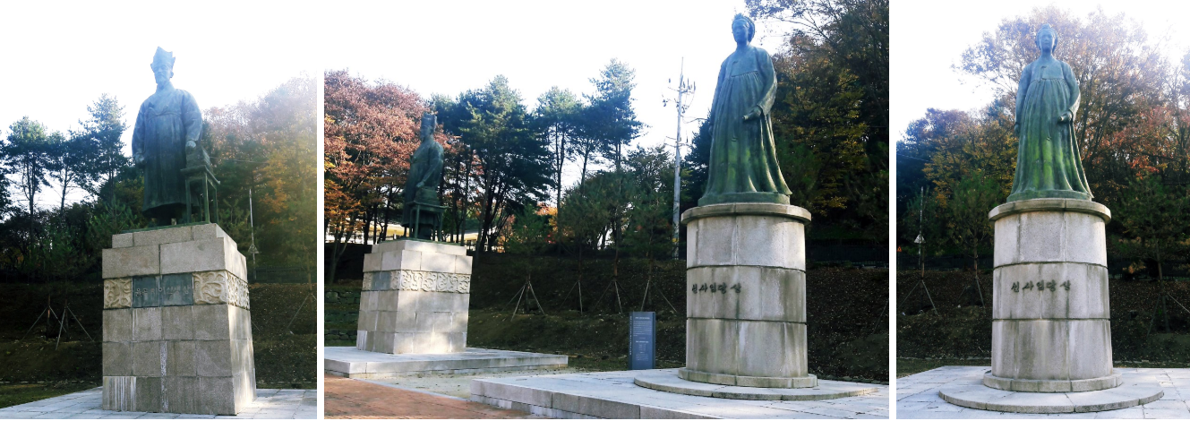 열린 문을 통해 들어가면 우측에 이율곡 선생과 신사임당 모자의 동상이 크게 서있습니다. 빛바랜 동상의 색깔을 보니 오랜 시간 서있던 동상의 시간이 느껴지네요.