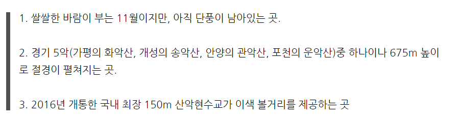 서울에서 멀지 않은 파주에 위치한 감악산은 약 80km 거리로, 자동차로 1시간 반정도 소요되는 거리에 위치해 있다. 불과 2년 전만 해도 국내 최장 150m 산악현수교라는 타이틀로 대형버스들이 즐비했지만, 최근에는 복잡하지 않게 출렁다리와 단풍을 만끽할 수 있다.
