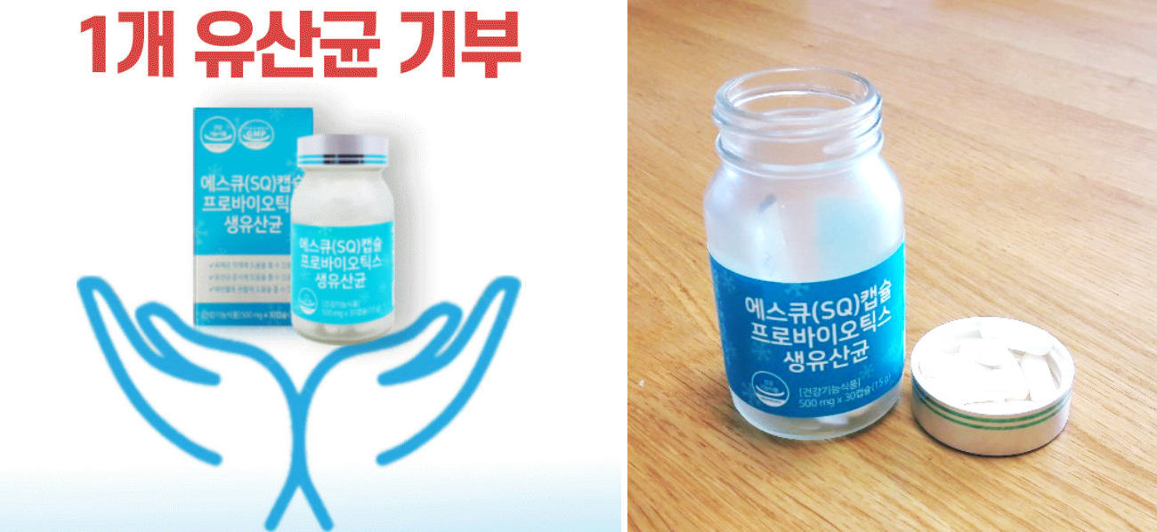 SQ제약에서는 다른 제품은 모르겠지만, 유산균 제품만큼은 10개 판매될 때마다 보육원에 유산균 제품 1개를 기부하고 있다고 한다.