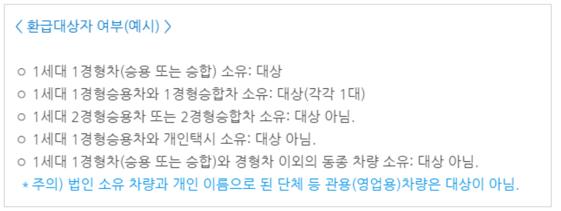 ○ 배기량 1,000시시 미만의 경형자동차 (승용ㆍ승합)를 소유하고 다음의 요건을 모두 충족하는 사람이 해당됩니다.