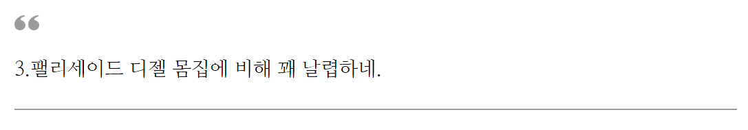 현대 팰리세이드가 그런 차라는 점에서 개성이 조금 더 강한 디자인으로 자신만의 색깔로 확실한 가치를 뽐내거나, 현대자동차 모델 아이덴티티를 따르는 정통성을 가진 모델였다면 이해가 됐겠지만...
