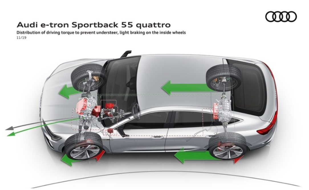 e-트론의 시스템 출력은 402마력으로 아우디 e-tron과 같다. SUV 쿠페로, 물 흐르듯 부드럽게 처리한 것이 기존 모델과의 차이점이다. 아우디는 e-tron 스포트백에 기본 장착되는 디지털 LED 매트릭스 전조등을 중점적으로 강조했다.