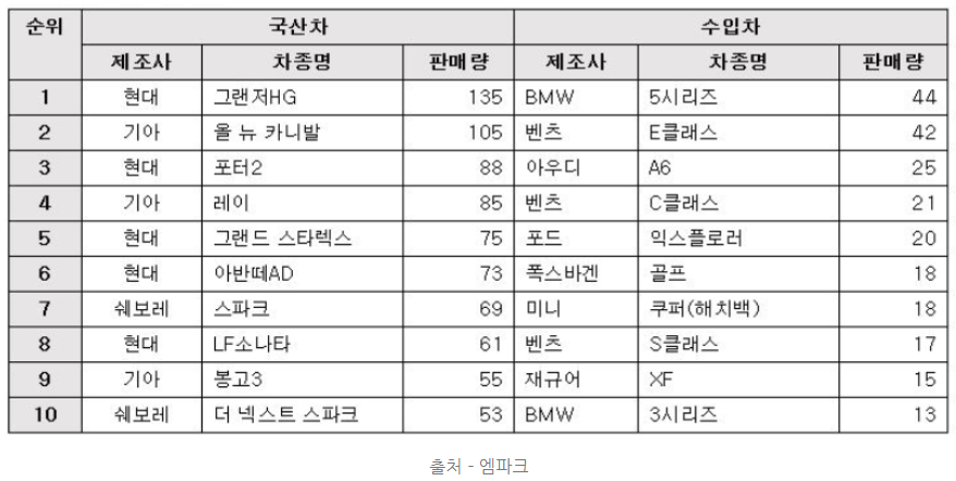 중고차 매매단지 엠파크가 2020년 1월 중고차 판매 정보를 분석한 결과 현대자동차 그랜저HG와 BMW 5시리즈가 국산차와 수입차 부문 판매량 1위를 각각 기록했다.