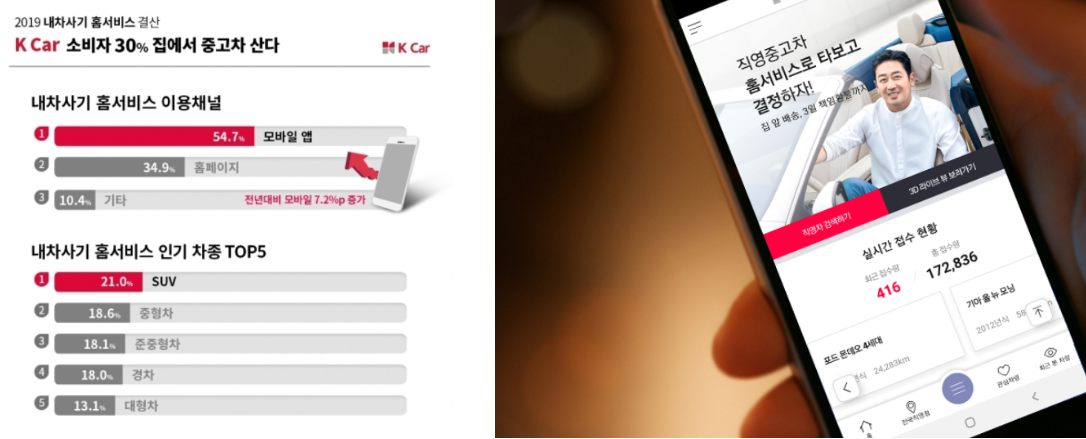 이용자 중 54.7%는 모바일 앱으로 구매했으며 모바일 이용자는 전년 대비 7.2%p 증가했다. 홈페이지를 이용한 소비자는 34.9%, 그 외 유선 전화를 이용한 소비자는 10.4%였다. 차종별로 살펴보면 SUV 구매 비중이 21%로 전년 대비 3계단 상승한 1위를 차지해 신차 시장에서의 SUV 인기가 중고차 시장에도 그대로 반영된 것으로 나타났다.