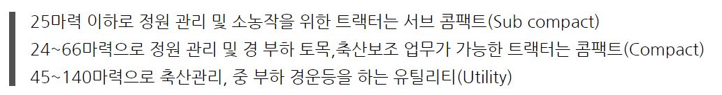 20~30마력의 트랙터는 정원/잔디 깎기용, 30~40마력의 트랙터는 소규모 농작업, 40~50마력의 트랙터는 소규모 농가/비닐하우스/과수 작업, 50~60마력의 트랙터는 과수원/골프장 작업, 60~75마력의 트랙터는 수도작/전작용, 75마력 이상은 수도작/전작/축산 등의 용도로 활용한다.