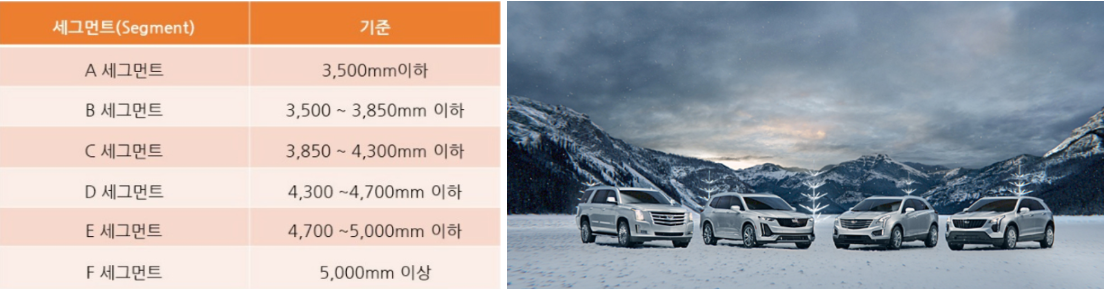 예를 들면 A 세그먼트는 전체 길이 3,500mm 이하의 작은 자동차, B 세그먼트 모델은 3,500~3,850mm 이하의 크기를 가진 자동차, 3,850~4,300mm의 크기는 C 세그먼트, 4,300~4,700mm의 크기는 D 세그먼트 등의 형식으로 구분해 소비자의 이해를 돕고 있다.