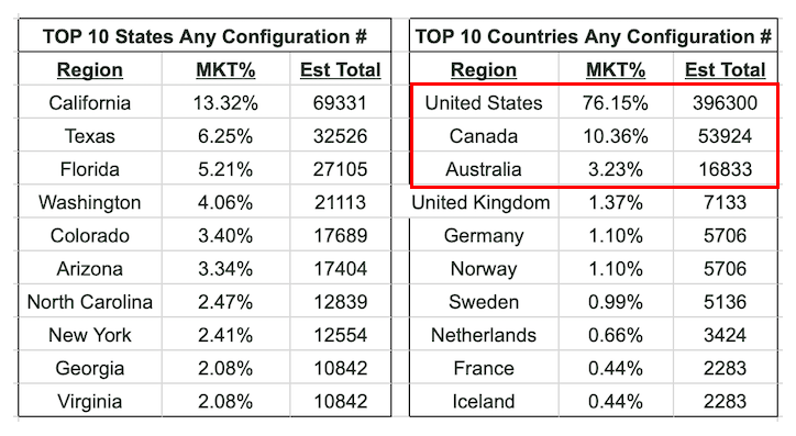 바로 사이버트럭이 계약되고 있는 국가들의 지표로 미국이 76%(약 40만대), 캐나다 10%(5.4만대), 호주 3%(1.7만대) 등 전통적인 픽업트럭 강세인 국가라는 점이 주목된다.