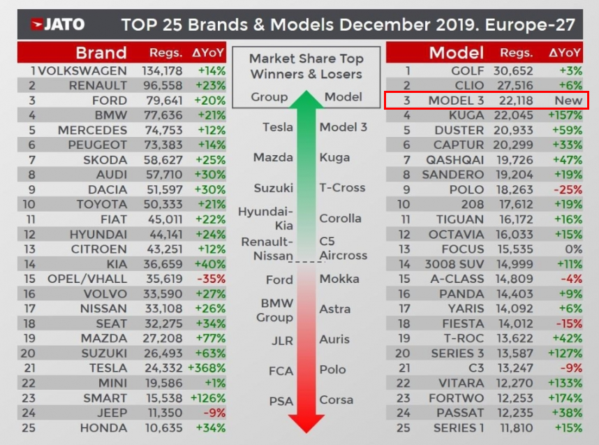 해치백과 소형세단이 강세인 유럽시장에서는 모델3가 지난 12월 폭스바겐 골프, 르노 클리오에 이어 유럽연합 27개 국가에서 가장 많이 판매된 베스트셀링에 기록되며, 전기차 이상의 가치를 증명하고 있는 상황이다.