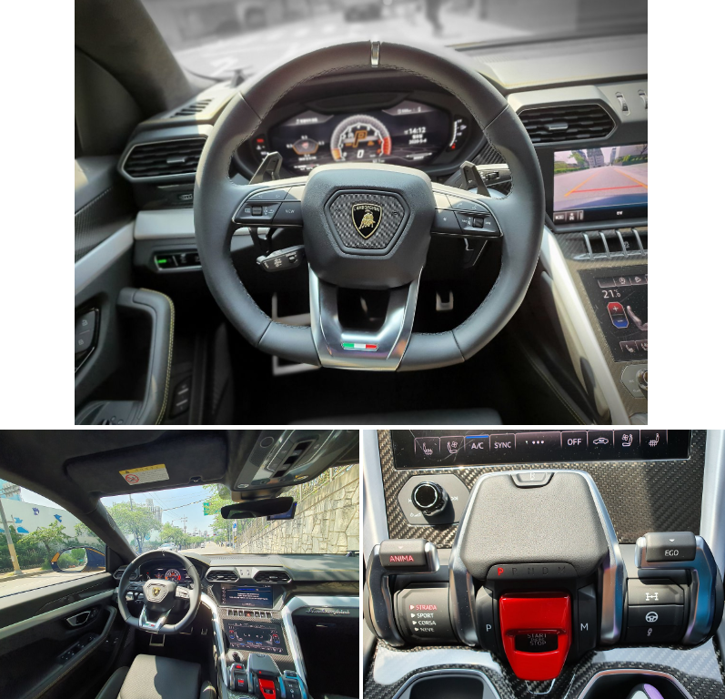 실내로 들어와 본 우루스의 인테리어는 가장 먼저 눈에 띄는 대쉬보드와 커다란 인포테인먼트 패널로 '넓다'라는 생각과 '하이테크'라는 단어가 같이 떠올랐다.