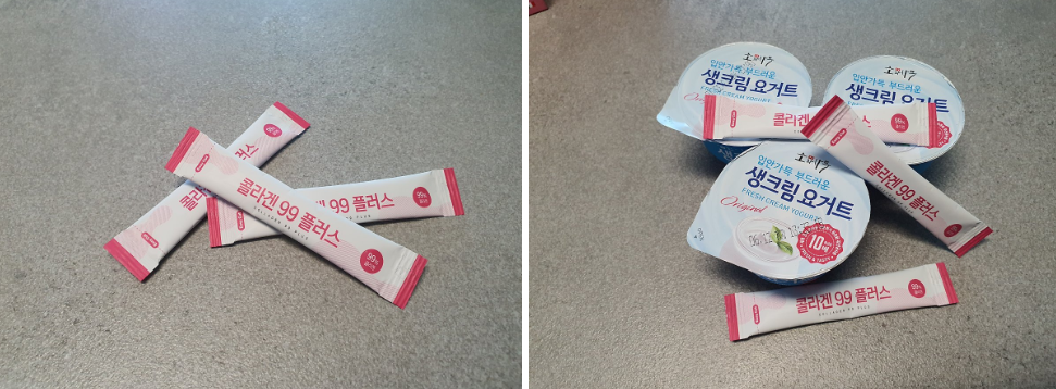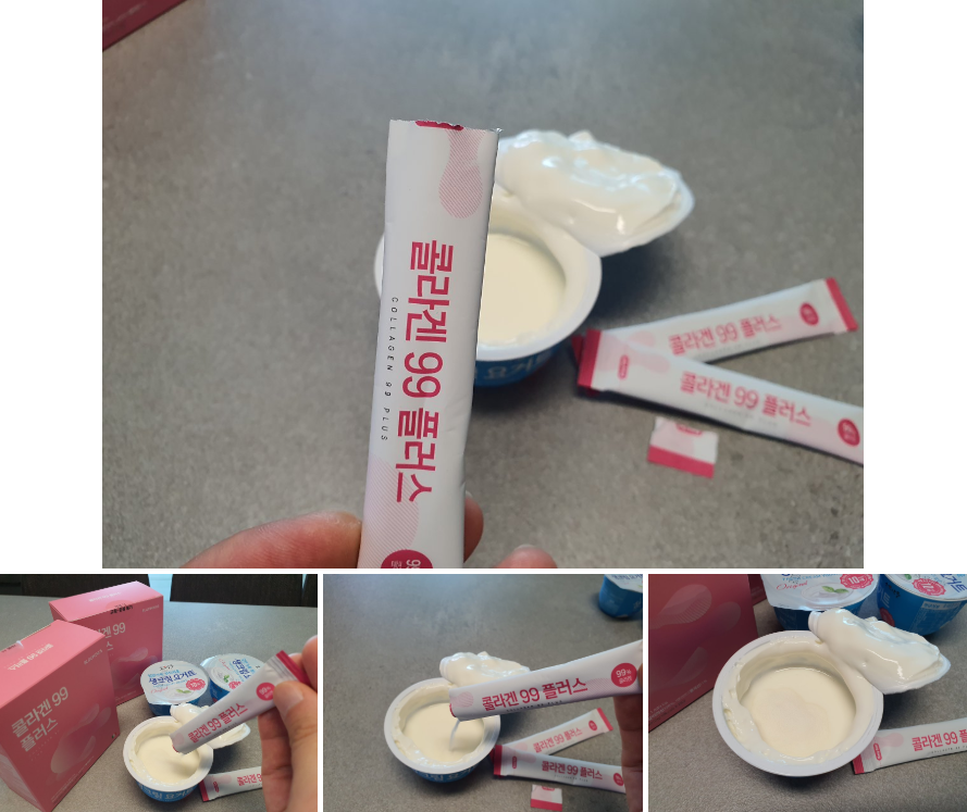 콜라겐을 선물받은 와이프는 요거트와 같이 먹는 걸 선호했다. 물과 함께 마시는 건 묘한 식감?? 목넘김이 있어서 느낌이 별로라고 한다.
