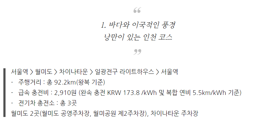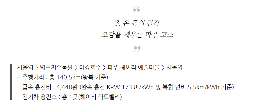 여기에 각 여행 코스에 전기차 급속 충전이 가능한 충전소도 1곳 이상 있으므로, 여행 중간에 충전까지 한다면 여행하며 내 에너지도 충천하고, 전기차 에너지도 완충한 채로 여행에서 돌아올 수 있다.