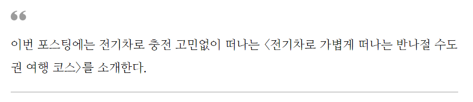 오늘은 전기차 충전 고민으로 먼 여행 길을 떠나기는 부담스러워하는 사람들을 위해, 전기차로도 충분히 다녀올 수 있고, 덤으로 전기차 충전까지 끝낼 수 있는 <전기차로 가볍게 떠나는 반나절 수도권 여행 코스> 3가지 코스를 소개했다.