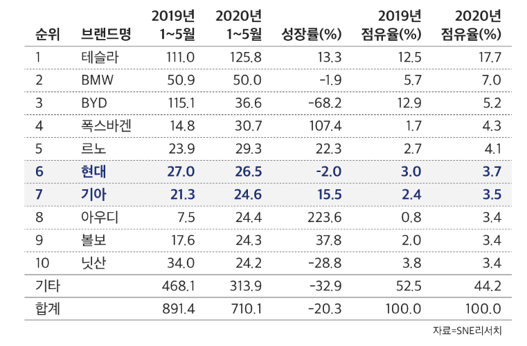 지난해 동기간 판매량에서 1위를 차지했던 중국의 비야디(BYD)는 코로나로 인한 자국 시장 침체로 3위(5.2%)를 기록했다. 폭스바겐은 파사트 GTE와 이업!(e-Up!) 신버전을 중심으로 비약적인 성장세를 보이면서 작년 동기 18위에서 올해는 4위로 껑충 뛰어올랐다. 4위였던 닛산은 경영위기와 전기차 리프의 부진으로 10위로 추락했다.