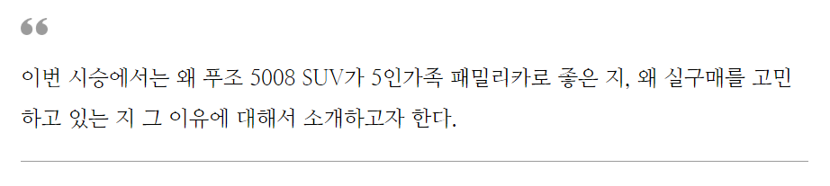 개인적으로는 오너가 아님에도 푸조 SUV 모델들도 시승을 많이 한 편이다. 그 중에서도 푸조 5008은 더 애정해서 시승기회가 있을 때에는 조금이라도 더 타보려고 가족과 나들이를 많이한 모델이다