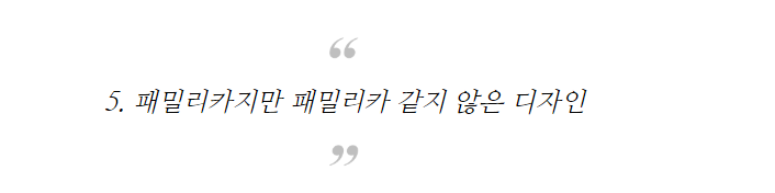 하지만 최근에 출시하는 패밀리카 모델들은 '패밀리'라는 틀에 갇히지 않고, 가족과 함께 레저를 즐기거나 라이프스타일에 녹아들 수 있도록 멋스러운 내외관 디자인을 갖춘 모델들이 나오고 있다.