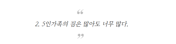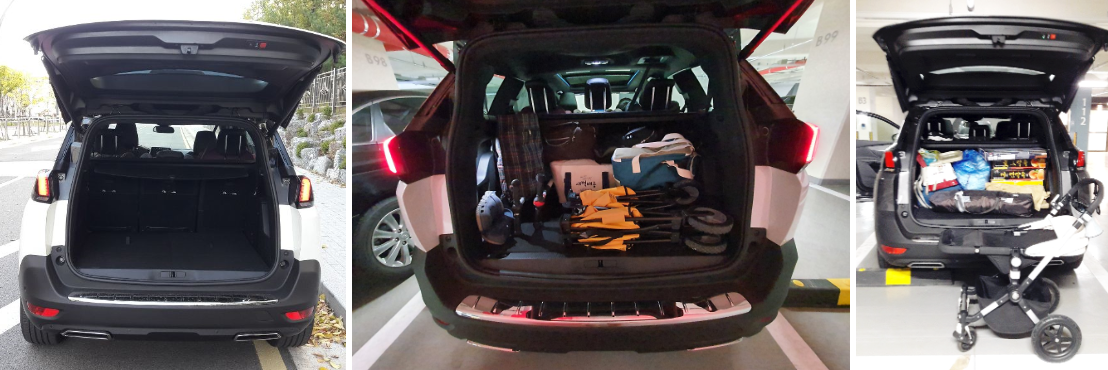 5인 가족의 경우에는 3열시트를 접어 사용할텐데 952ℓ라는 적재용량은 원하는 모든 짐을 다 실기에도 부족함이 없다. 여기에 트렁크의 속깊이가 길어서, 쌍둥이용 유모차 1개/여행용 캐리어 2개/접이식 그늘막텐트 1개 등....짐의 수량과 부피에 대한 고민없이 가지고 다닐 수 있다.