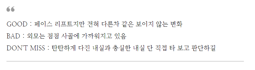 저는 아직 쪼랩이라 꼴랑 80km 정도 타 보고 차가 어떻다 결론을 내릴 수는 없지만 기본기가 탄탄하고 이전 모델보다 훨씬 좋아졌으며 다양한 편의장비와 안전장비가 추가되었다는 것은 확실하게 얘기할 수 있습니다.